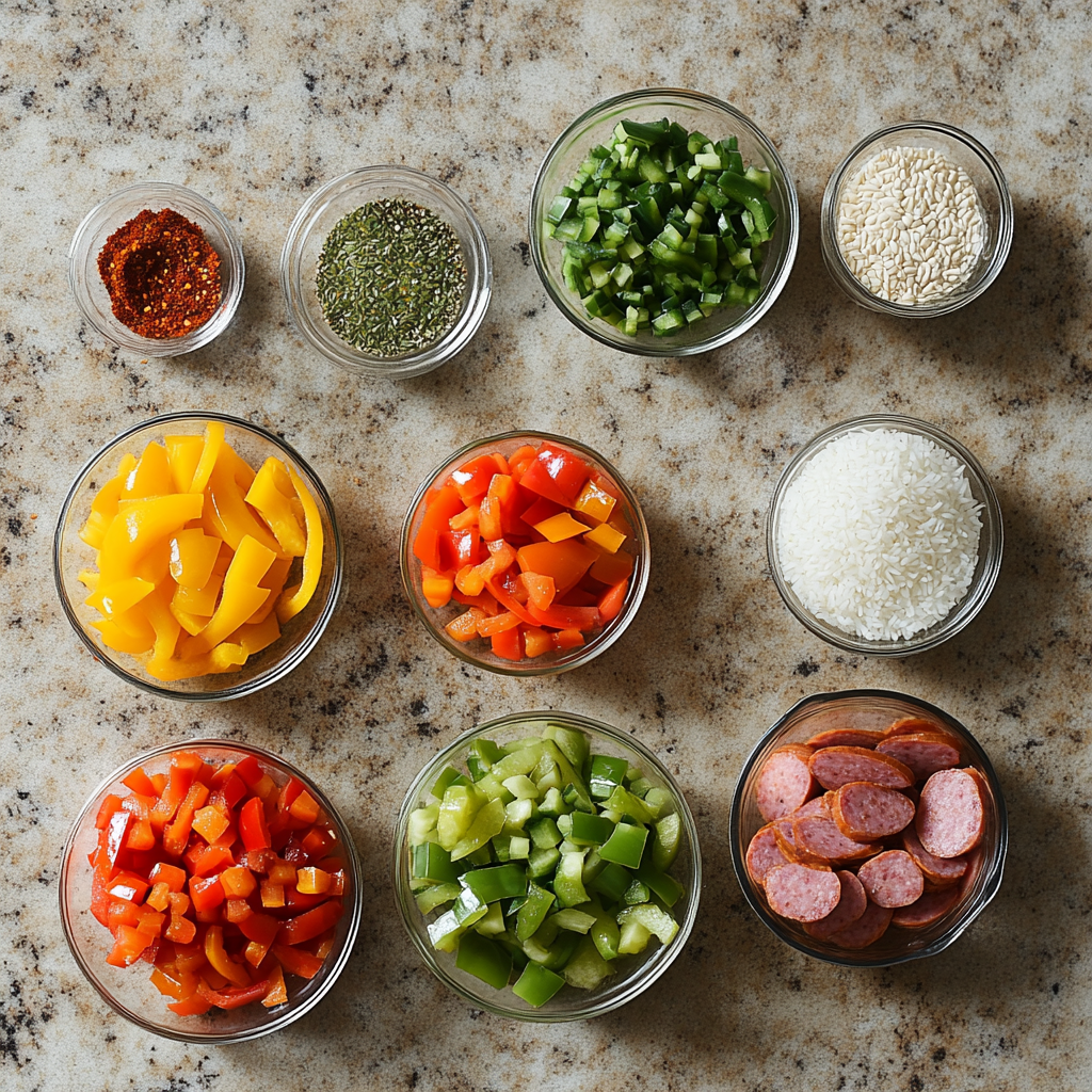Add Remaining Ingredients: Add rice, peppers, sausage, seasonings, and broth. Stir to combine.